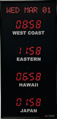 The 368 series time zone clocks has a dot matrix LED date, bar-segment LED time displays with white vinyl zone labels. The date can be arranged in any format and can include Julian dates. For instance you could have 14 APR 08 or FRI APR 14. The 368 models display between 2 and 10 time zones.