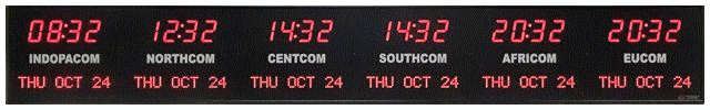 The 6637 series time zone clocks have bar-segment LED time with white vinyl zone labels in the middle of each zone. The date is displayed with 10 character dot matrix LEDs. 6637 models can display 2-8 time zones.