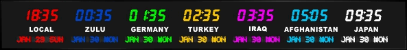 6637E | 6 Zone Clock with 1.8" blue bar segment LEDs for the time, yellow 1.2" dot matrix LEDS for the date and 0.75" white vinyl lettering for the zone labels. | |
