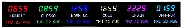 | 6673P | 6 Zone Clock with standard 2.5" red bar segment LEDs for the Time, 1.2" green dot matrix LEDs for the zone labels and 1.2" yellow dot matrix LEDs for the date | |